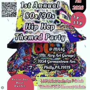 Mt. Airy Art Garage is thrilled to present the 1st Annual ’80s/’90s Hip Hop Party—a celebration of the golden era that shaped hip hop and R&B culture. Whether you grew up in the ’80s and ’90s or simply appreciate the timeless classics, this event promises an unforgettable night of music, nostalgia, and community.