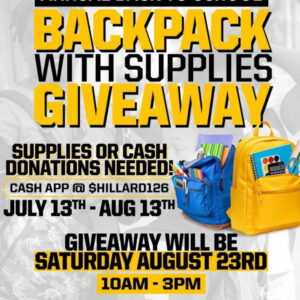 Students and their families are invited to come to the giveaway event on Saturday, August 23rd. Students should plan to be present to receive their backpack. Bring a valid ID if possible to help with registration.