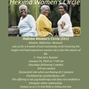 Ujima Life Services invites you to the Hekima Women’s Circle, an enriching 6-week virtual gathering created exclusively for Black women aged 55 and above. In this season of life, you carry a wealth of insight and lived experience. The Hekima Women’s Circle honors this journey by providing a nurturing and confidential space to explore themes of purpose, boundaries, aging, grief, joy, and freedom.